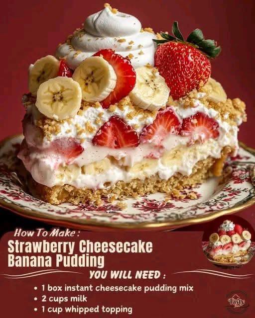 This Strawberry Cheesecake Banana Pudding is a creamy, fruity, and indulgent dessert that combines the richness of cheesecake with the sweetness of bananas, strawberries, and vanilla pudding. Layered with graham crackers and topped with fluffy whipped cream, this dessert is perfect for any gathering or as a sweet treat to end the day!